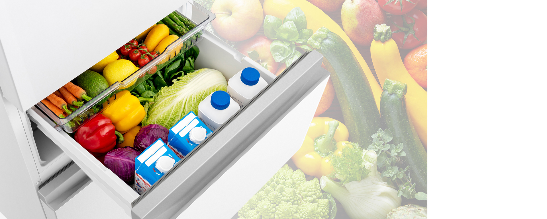 ちょうど良い高さで開けやすい真ん中の野菜室は、整理しやすい2段式の引き出し。上下段での大容量で野菜のまとめ買いも安心です。下段の手前に1000ml紙パックも4本収納可能です。