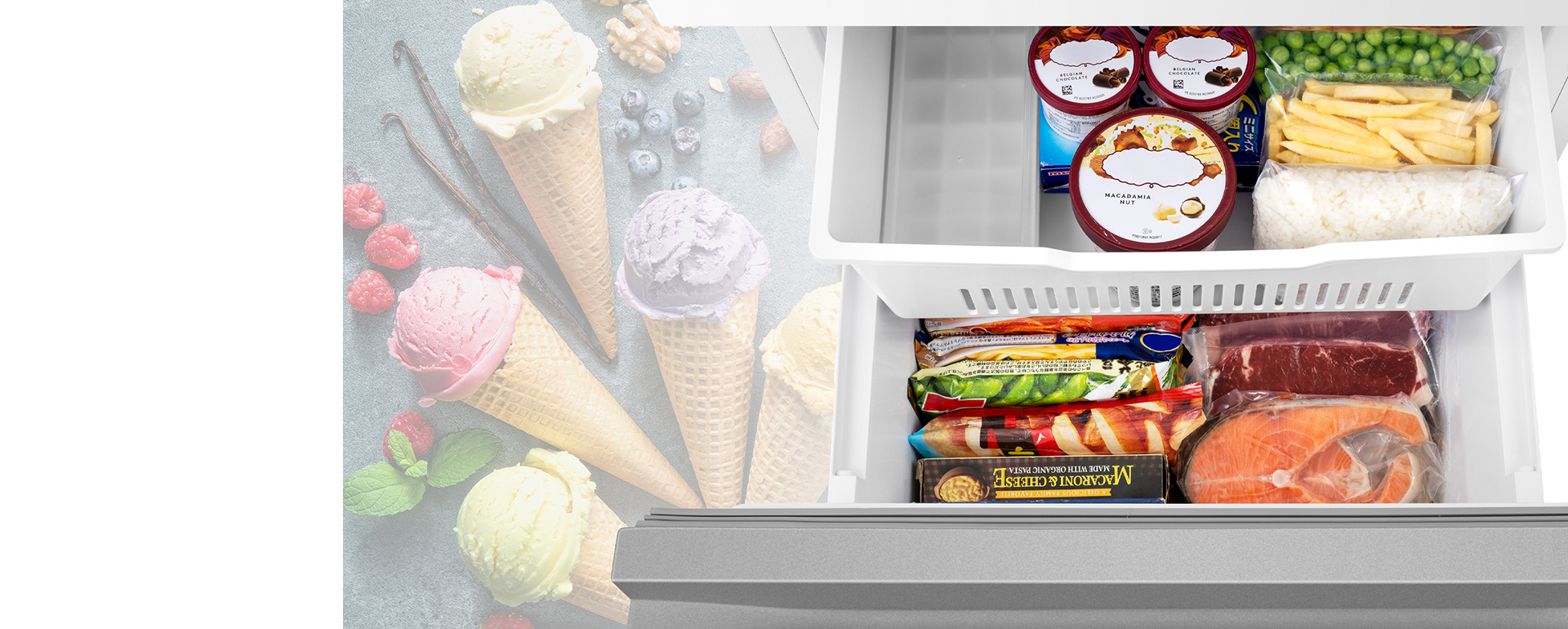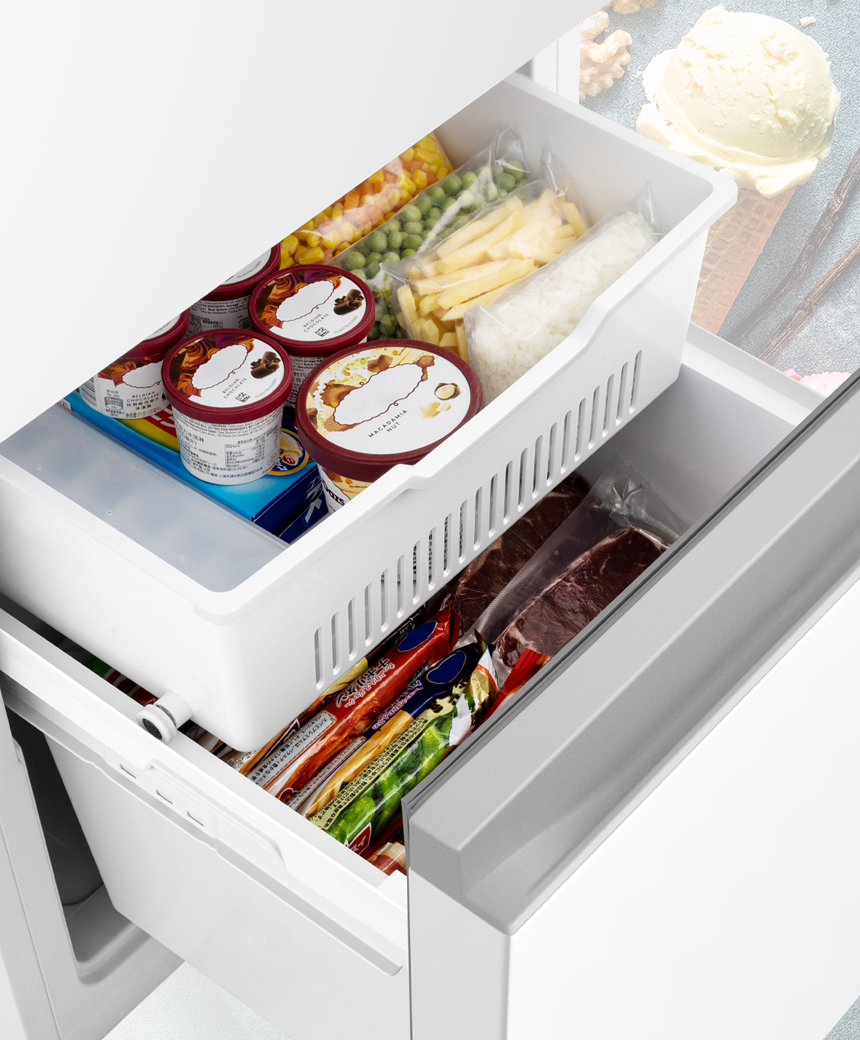 まとめ買いした時や大きな食材を購入しても安心の83L※大容量冷凍室。出し入れしやすい2段式収納はアイスクリームや冷凍食品を見やすく整理をして収納ができます。