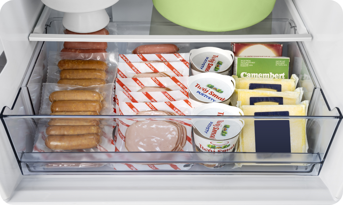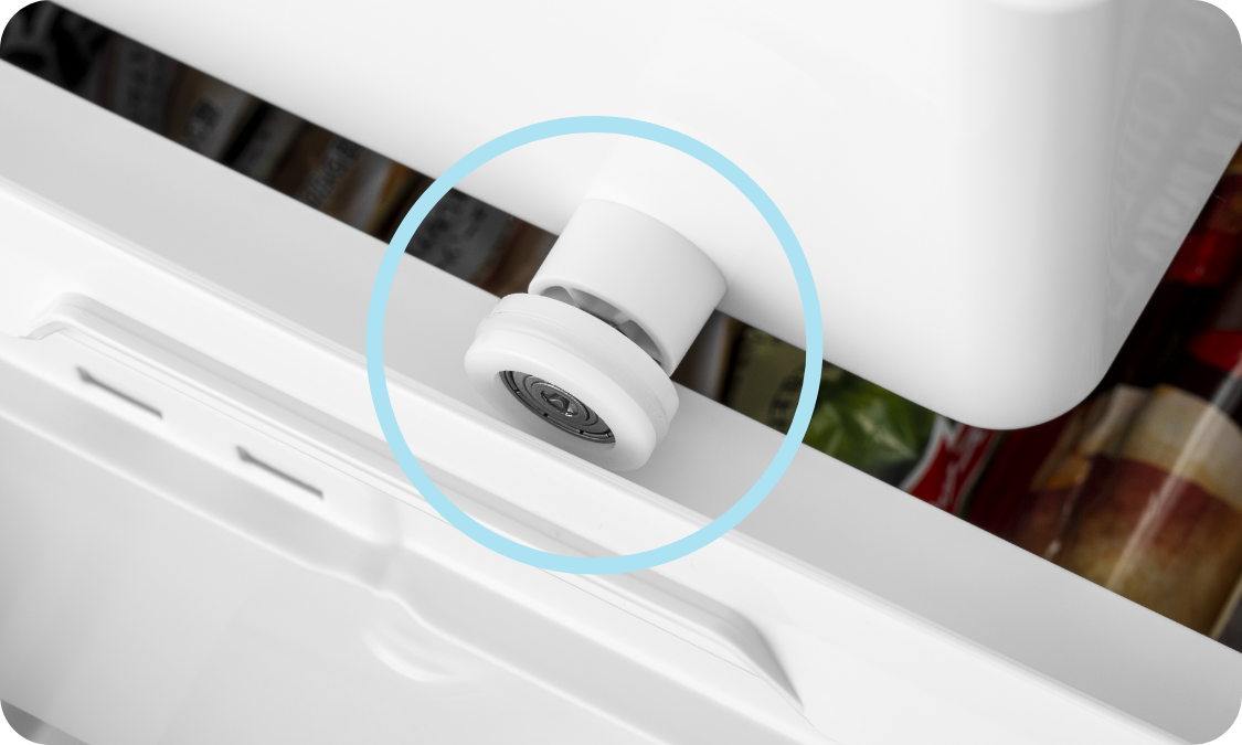 冷凍室の引き出しは、軽い力で大きく開いて、奥の食品までよく見えます。ローラーの付いたトレーは重い食材を収納してもスムーズに引き出せます。