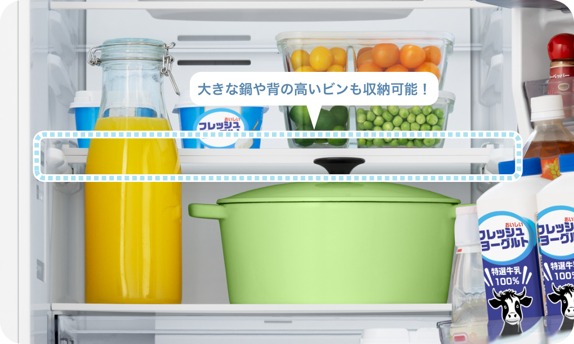 食材の大きさや用途に合わせて棚を折りたたみ、使い分けが可能。大きなお鍋や背の高いビンなどの保存に困ることはありません。