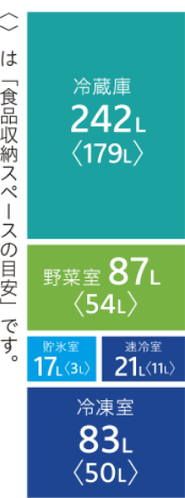冷蔵室も冷凍室も、驚きの収納力。毎日使う食材も、常備しておきたい冷凍食品も、たっぷり入って、出し入れもしやすい。わが家にぴったりな大容量の冷蔵庫です。