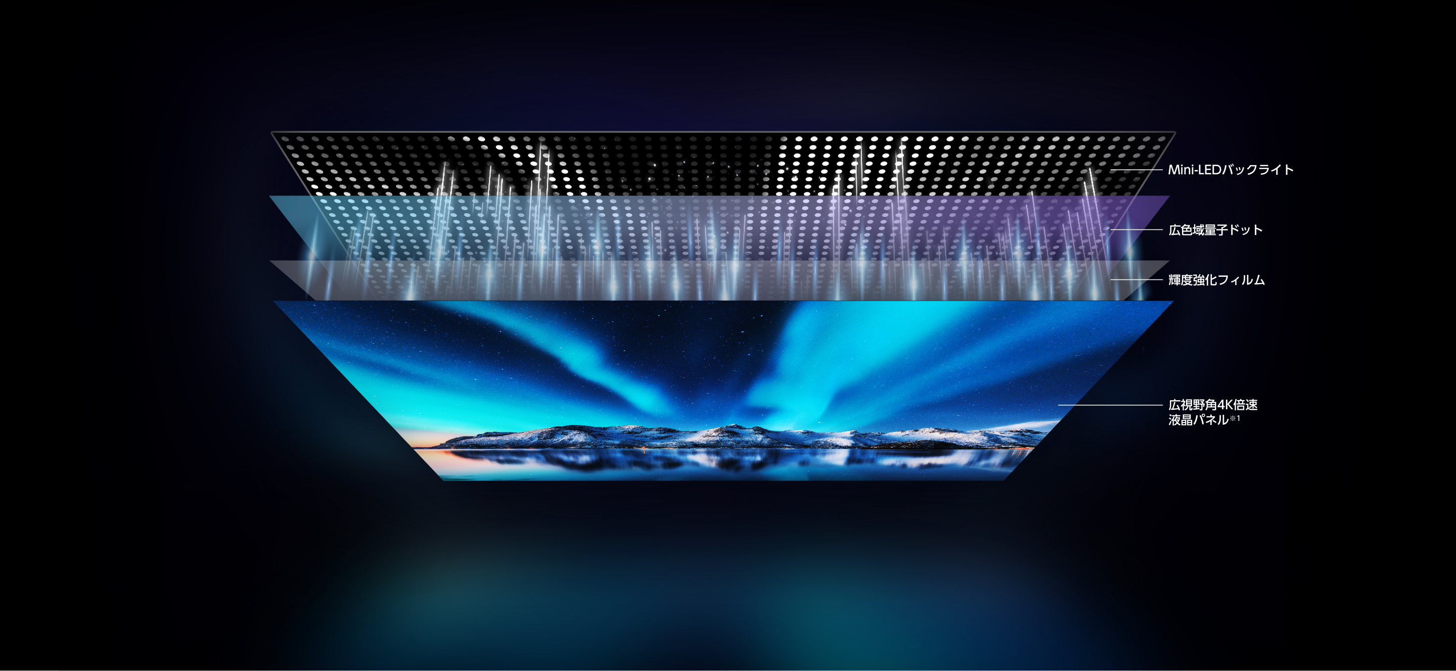 従来の直下型LEDバックライトよりも小型のLEDバックライトを数多く敷き詰めることで、 細部までメリハリのある、明るく高コントラストな映像を実現しています。旧型と比べ、最大輝度が87%向上しました※2。さらに、AIエンジンがMiniLEDバックライトを細かくエリア分割しコントロールすることで、ワンランク上の精密なコントラスト表現を実現します。
