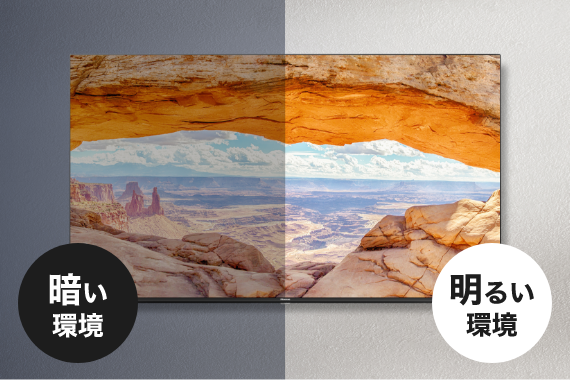 テレビの下の面に搭載されるおまかセンサー(環境光センサー)により、部屋の明るさに応じてテレビのバックライトの明るさを自動的に調整します。消費電力も抑えられます。さらに、「暗い部屋でももう少し明るい画面で観たい」ときなど、明るさ詳細設定でカスタマイズができます。