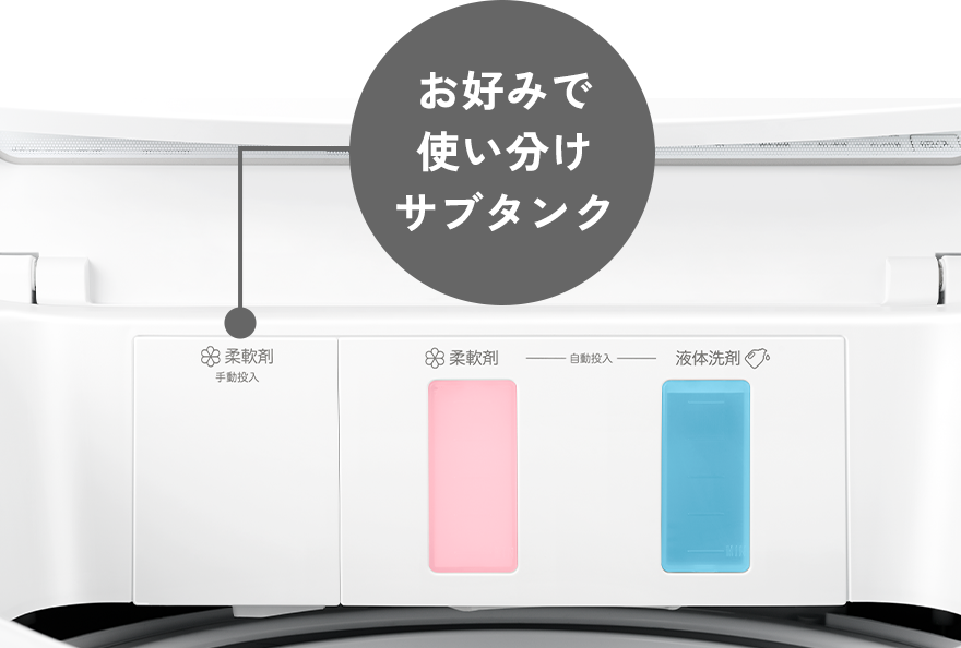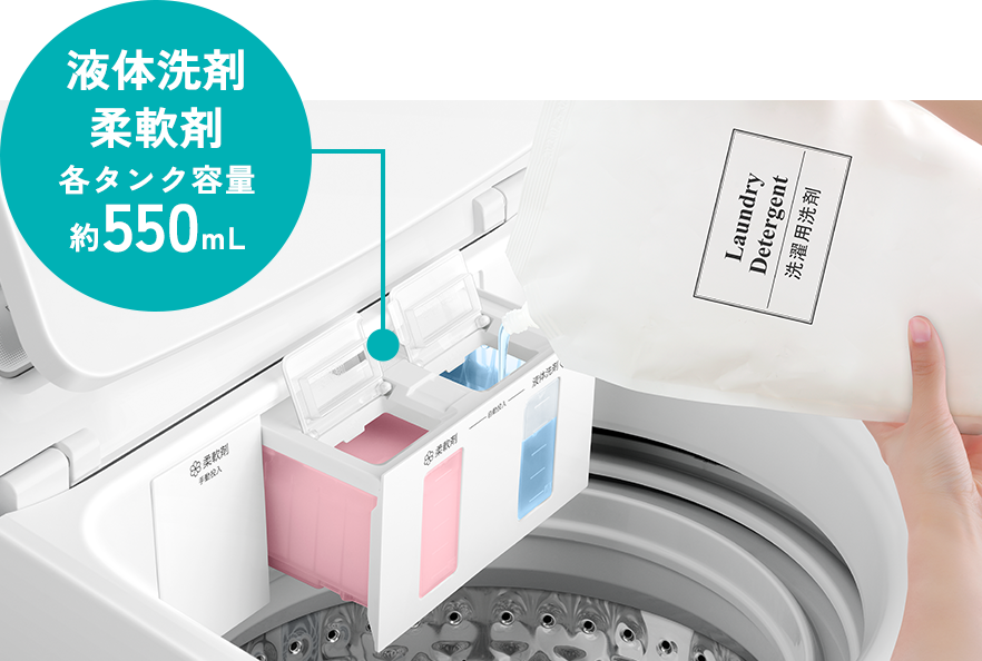 小型洗濯機にも、液体洗剤・柔軟剤各約550mLのタンクを搭載。