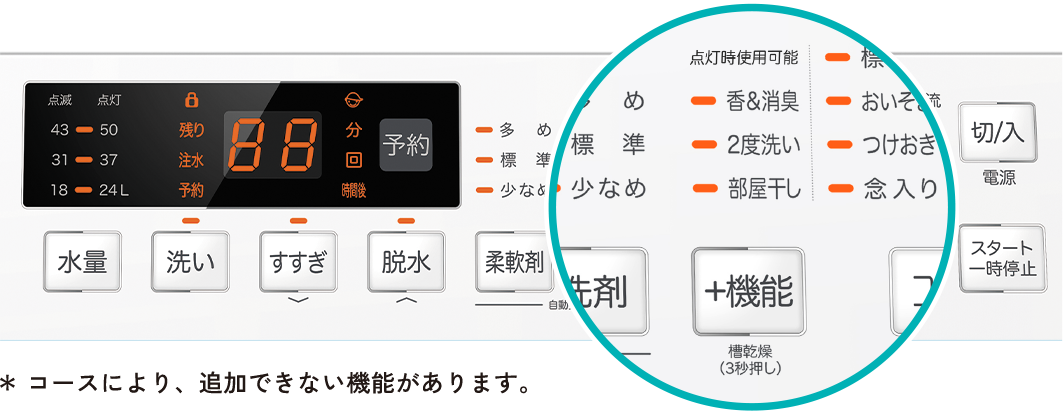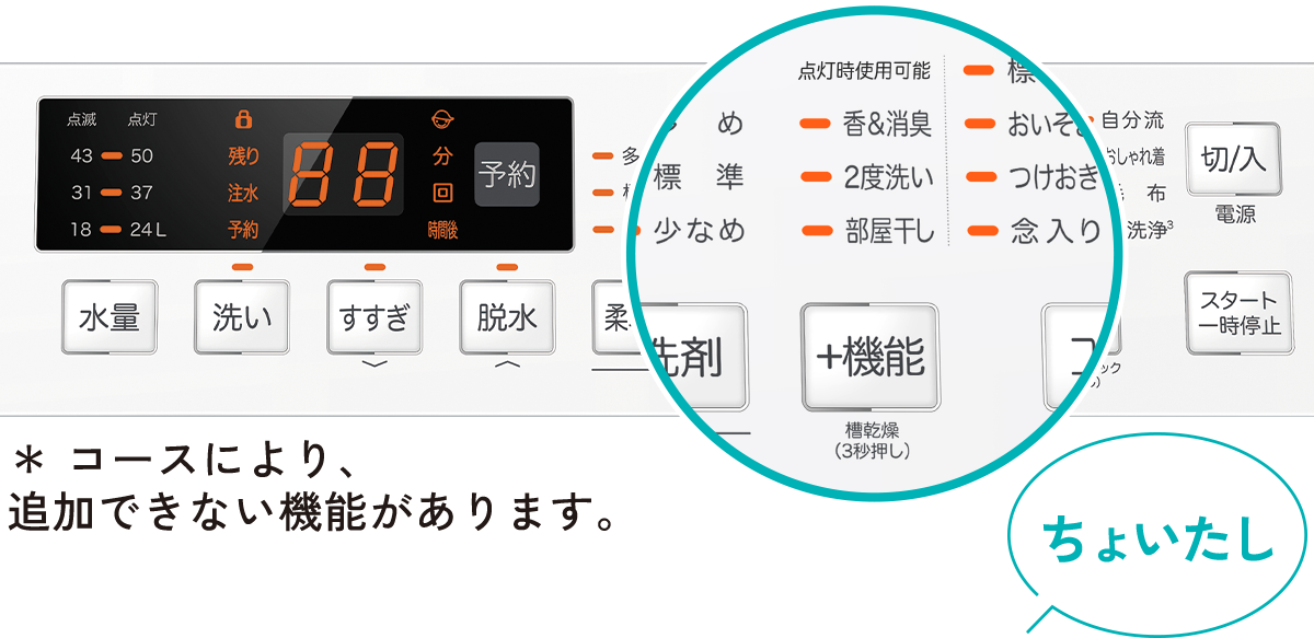 いつもの洗濯コースにボタンひとつの簡単操作で「香&消臭」「2度洗い」「部屋干し」の機能をプラスできます。
